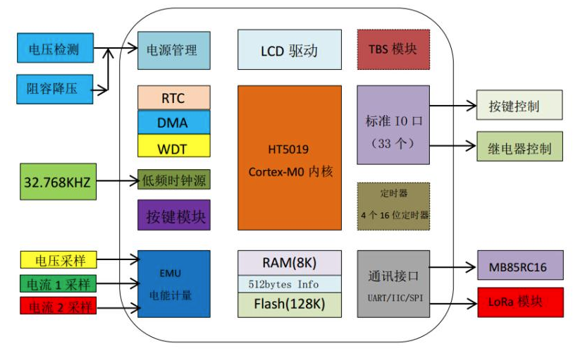1.本方案采用钜泉光电全SOC芯片HT5019进行设计,该芯片集成了电能计量、RTC时钟、LCD驱动等外设模块,非常适用于电能计量插排、出租屋电表、空调用插排等产品上。