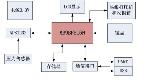 2. 高性能ARM芯片MB9BF516N,内置USB外设,可以实现host和device的切换,方便收银秤和电脑、U盘等外设的通信。